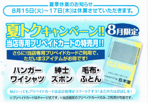 夏季休業のお知らせ 誠に勝手ながら8月15日(火)16日(水)17日(木)お休みさせて頂きます ★半年に1度の当店専用プリカの特売8/1よりスタート!! トップ/集配エリア こだわりのクリーニング しっかり安心納得の特殊クリーニング 特殊加工 便利なサービス 料金案内(店頭/集配) 店舗案内 会社概要/求人情報 お問い合わせ/集配依頼(営業関係の業者の方はご遠慮ください)