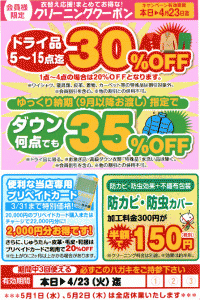| ①ドライ品5点以上お持込で30%OFF。 | ||