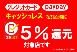 上記の決済でお支払のお客様に5%還元になります。2020年6月30日迄