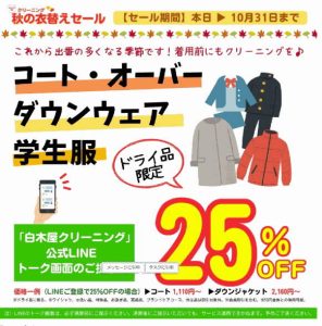 ●●SALE開催中!●● ◆コート・オーバー ・ダウンウエア・学生服がおトク LINE トーク画面ご提示で 「25%OFF」、1点から受付