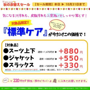 対象品限定で今だけお得に受付中! 通常のクリーニング代に左記の料金をプラスして ついでにそのまま仕舞える「不織布カバー」を 付けて仕舞い込み!